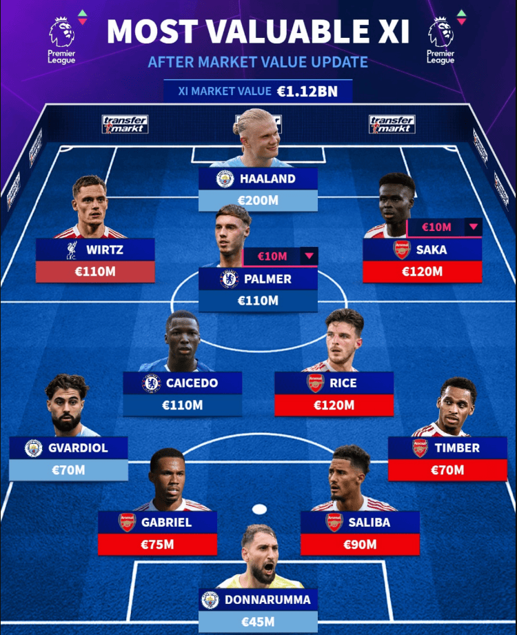 《德转》给出的英超最贵阵容则是阿森纳占据5席,曼城3席,切尔西2席,利物浦1席,这11人总身价达到了11.2亿欧,具体如下:
